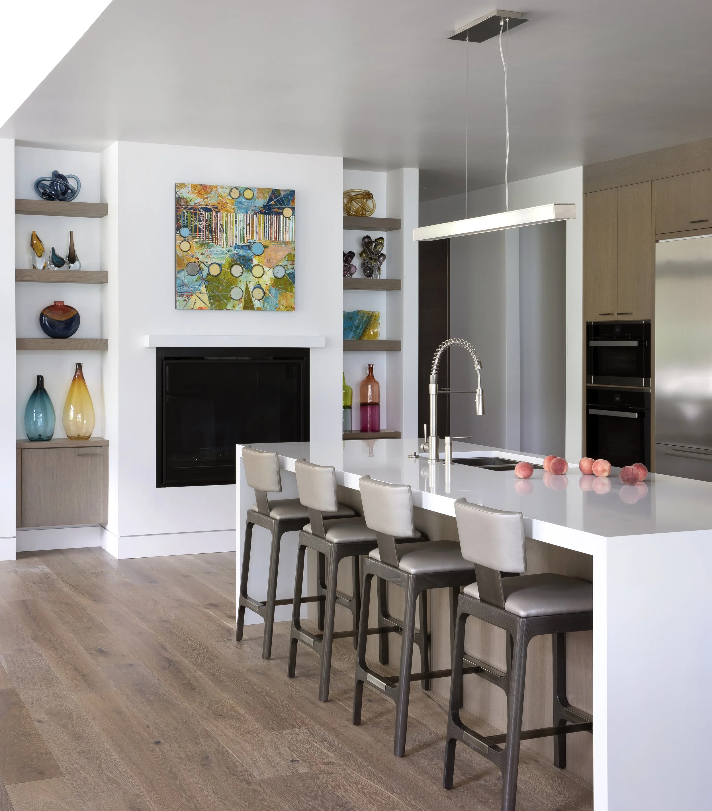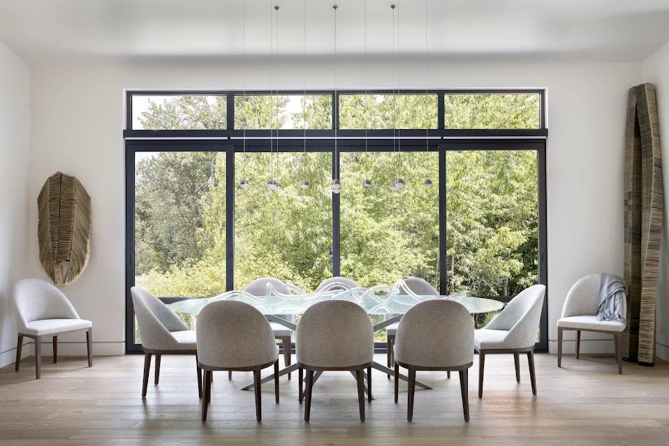 This home embraces a palette of layered neutral tones, creating a gallery-like backdrop that highlights the collection of original artwork throughout the space. Thoughtfully selected materials and textures guide the eye toward vibrant, curated focal points while also framing views of the natural landscape beyond. Intimate, smaller rooms lend a warm cottage sensibility, balancing the clean lines of the contemporary design with a sense of comfort and charm.